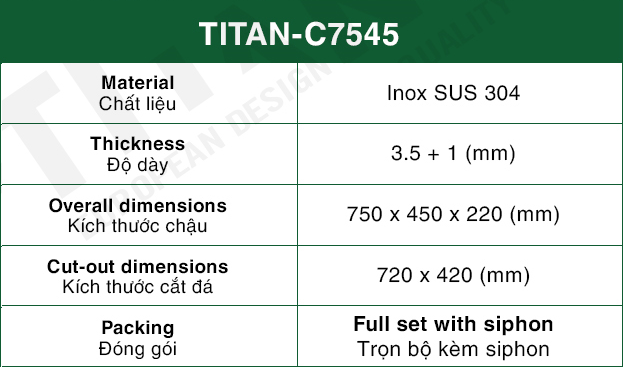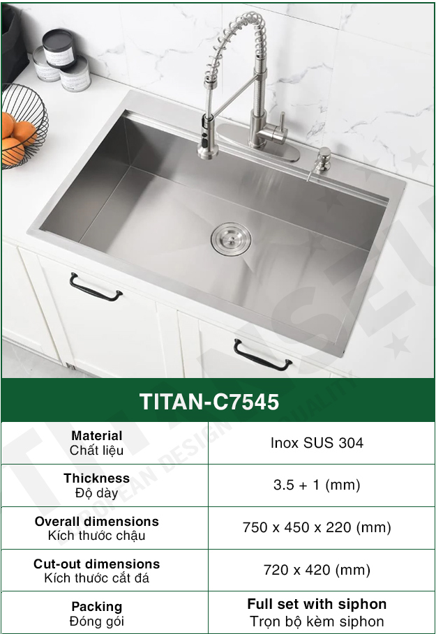 Chậu Rửa Bát 1 hố INOX SUS 304 TITAN-C7545 TITANSEU