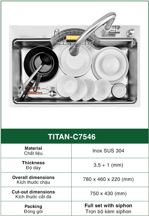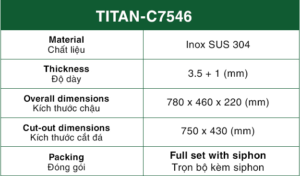 Chậu Rửa Bát 1 hố INOX SUS 304 TITAN-C7546 TITANSEU
