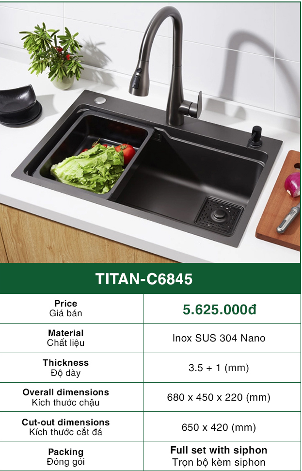 - Phụ kiện đi kèm: Bộ xiphon, rổ ráo nước inox cao cấp