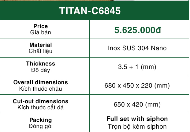- Tên SP: Chậu 01 hố Inox SUS 304 phủ nano cao cấp KT6845
