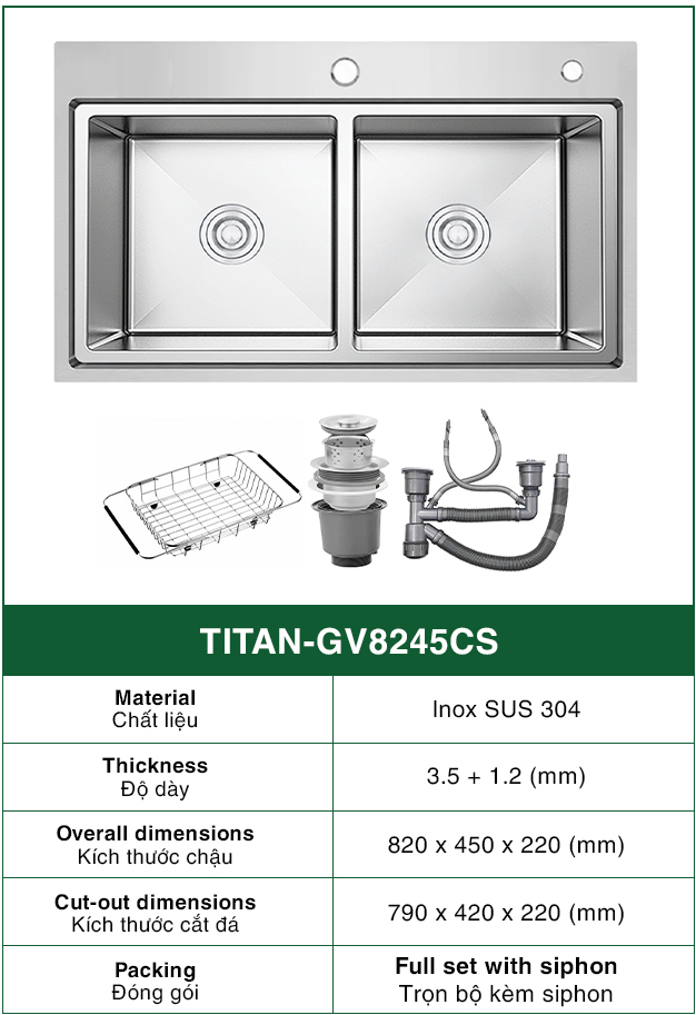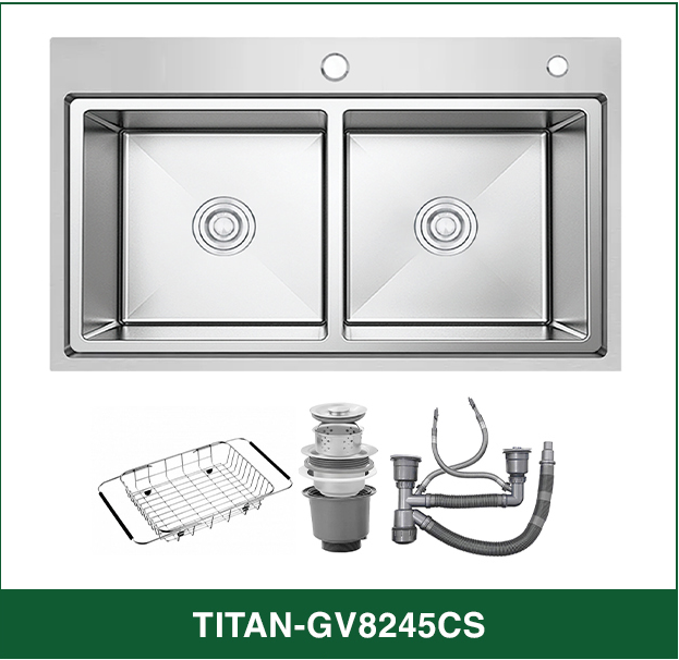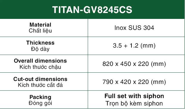 Chậu Rửa Bát 2 hố cân hạ bậc INOX SUS 304 TITAN-GV8245CS TITANSEU