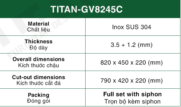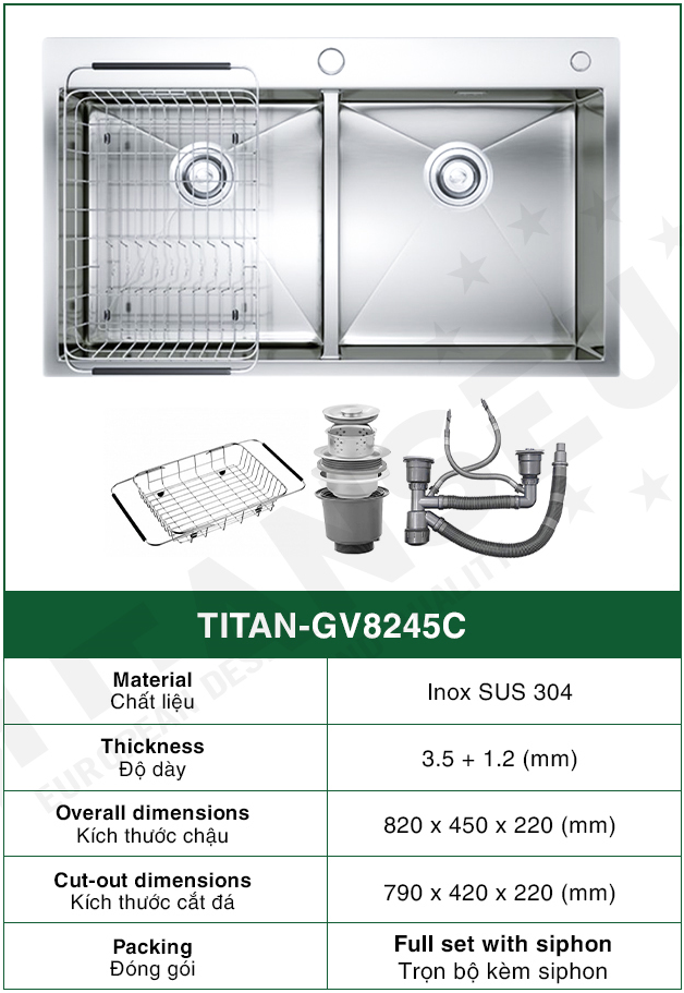 Chậu Rửa Bát 2 hố cân INOX SUS 304 TITAN-GV8245C TITANSEU